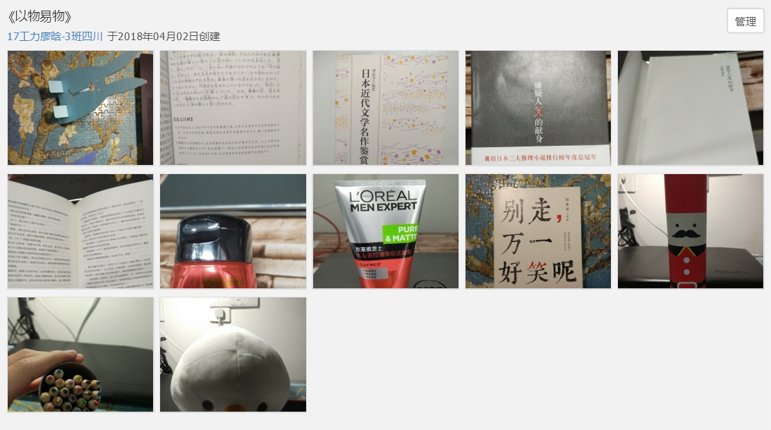 为了帮助同学们提高节俭意识和环保意识。班委们自201845日清明节期间,在班上建立了物品交换平台,通过照片以及文字介绍的方式将自己用自己用不着的或不太喜欢的物品摆放在线上平台上,然后来交换自己喜欢的物品。