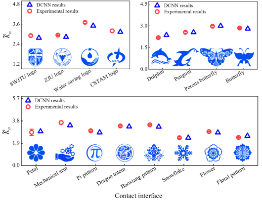 建立的深度学习模型能表征接触界面上压头之间的弹性相互作用,并表现出卓越的预测能力与鲁棒的泛化能力。即使对于那些几何构型高度复杂的不规则样本(图3),当前深度学习模型的预测结果与实验数据高度吻合(图4)。此外,本研究引入的图案复杂度概念,消除了深度学习中仅依赖人直观感知评估样本特征多样性的非理性评估方式。这是深度学习中各类预测目标特征多样性评估的实质性进展。