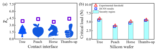 图5. 通过硅片的拾取实验验证当前的深度学习模型(DCNN)。 (a)当前模型预测的具有定制化“树状”、“桃子”、“马头”和“点赞”图案接触界面的归一化接触刚度