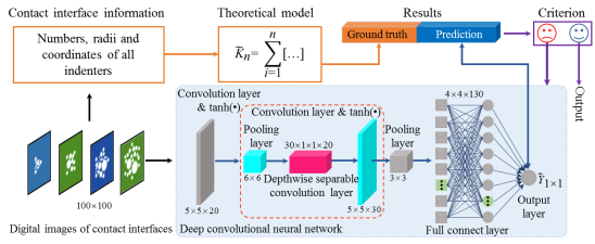 李翔宇教授课题组针对该问题,构建了深度学习模型(图2),从图案化的角度预测具有复杂非规则构型接触界面的接触刚度。在网络架构方面,设计了具有特征融合能力的深度可分离卷积层,来表征非规则压头间复杂的弹性相互作用;在特征评价方面,引入图案的复杂度指标,从样本构型的复杂程度来量化和确保样本的几何多样性;在模型性能评估方面,通过系统的压痕实验检验深度学习模型的预测精度和泛化能力。