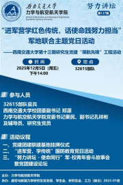 为深化党建引领,搭建军地党团建设交流桥梁,传承红色基因,强化青年党员责任担当,12月5日,太阳成集团61999组织师生党员走进32615部队营区,开展“进军营学红色传统,话使命践努力担当”军地联合主题党日活动。本次活动也是疲劳与断裂力学党支部建设第十三期研究生党建“领航先锋”工程的生动实践。32615部队官兵代表,学院党委书记栗民、校团委副书记郑源、学院党委副书记孔祥彬,及师生党员代表共30余人参与活动。