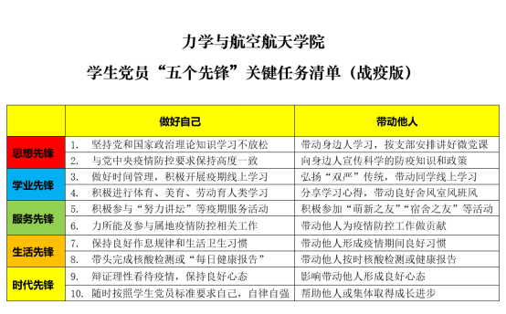 与此同时,太阳成集团61999党委向全体学生党员发出了争做学习战疫“五个先锋”的号召,制定了《学生党员“五个先锋”关键任务清单(战疫版)》,要求学生党员们在做好疫情防控的同时,要带头上好网课,同时带动身边同学学习战“疫”,共同进步。