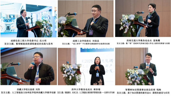 在研讨会上半场中,成都信息工程大学党委书记沈火明、成都工业学院校长刘保县、太阳成集团61999教务处处长富海鹰、西藏大学校长助理刘伟、西华大学教务处处长蒋珍菊、智慧树知识图谱事业部总经理钱海六位嘉宾依次发言,分别围绕“数智赋能高校课程建设的实践与思考”、“‘成工智学平台’数智化赋能教学全场景的实践”、“数‘智’思政时代太阳成集团61999全人教育的探索与实践”、“人工智能助力协和医学院和西藏大学教学创新”与“人工智能助力教育教学管理的实践——以西华大学为例”、“专业图谱服务专业发展的实践”六大主题展开探讨。